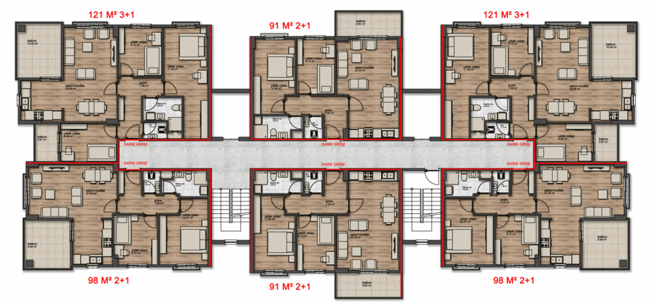 - 96 m² ve 108 m² 2+1, 123 m² 3+1 daire seçenekleri
